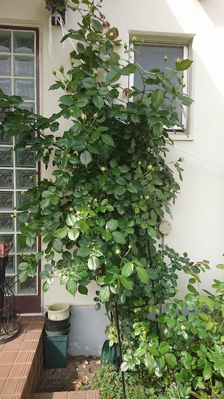 予想以上の樹勢に押され、一度オベリスクが倒れてしまったので、今はとりあえずすずらんテープで押さえています。こんな時に、支柱の大切さであったり、オベリスクの土台作りがどんなに大切かを思い知ります。