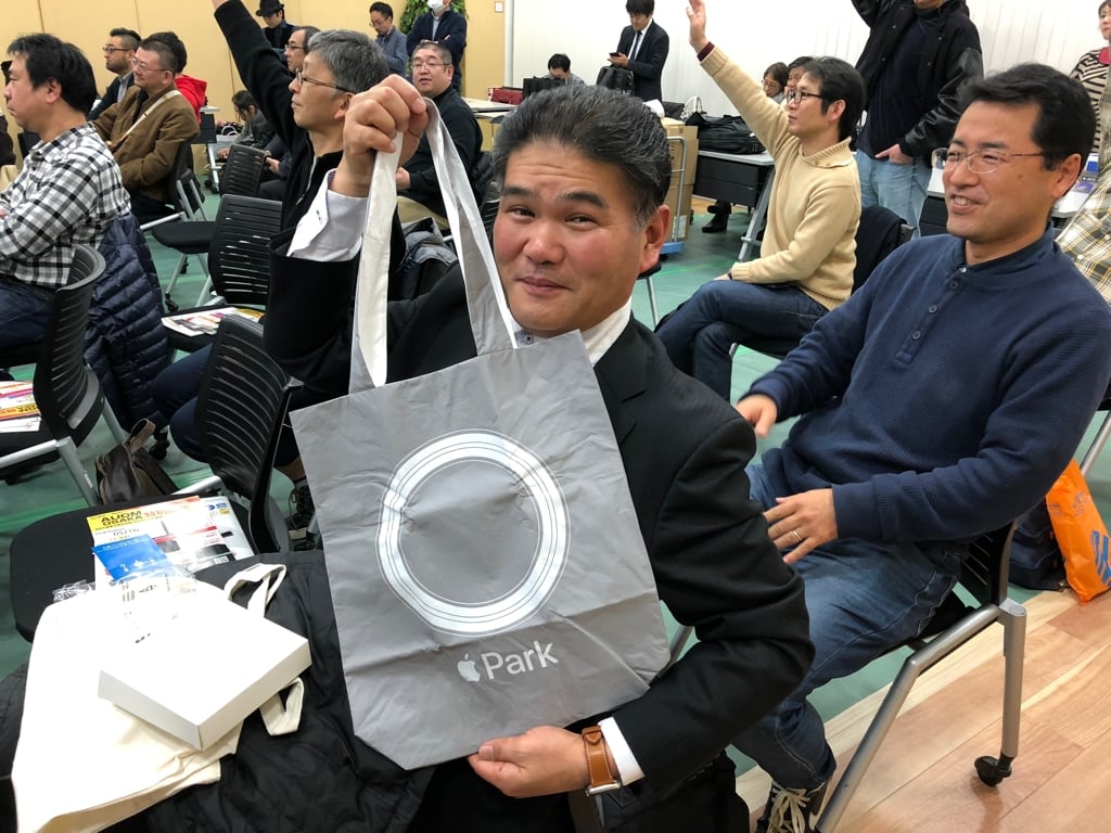 最後はじゃんけん大会で、Apple新本社で購入してきたトートバッグやTシャツなどを放出しました。これらはApple新本社でしか購入できないレアアイテムなので、来場された方も大喜びでした。私は製品自体をじゃんけん大会に出すと購入された方は面白くないかなと思うので、出さないようにしており、当社のノベルティグッズだったり、こういうレアアイテムの方が盛り上がりますね。