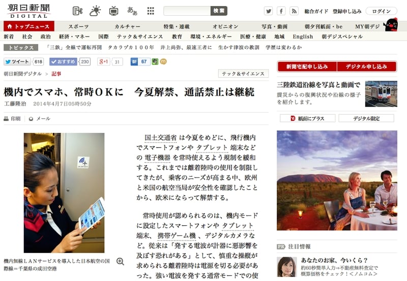 紙の本をすべて電子書籍に置き換えている人なども、離着陸時にも読めるようになるので嬉しいところですね。今後、機内でWi-Fiによるインターネット接続も普及してくれば、飛行機の移動でも仕事に遊びにいろいろとできるようになるので、そのために新幹線を選んでいた人もたくさんいますので、顧客の取込にも有効ですね。