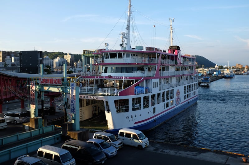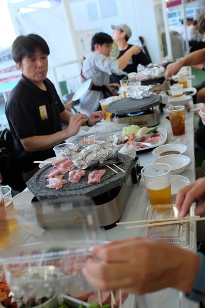 AUGM鹿児島としてのオフィシャルイベントである「前夜祭」は夜7時から始まりました。今年はいつもようにどこかの料理店で集まるのではなくて、納涼船に乗って桜島を見ながら溶岩焼きを食べ、最後に花火を見るというクルーズツアーでした。この日が初日だったらしく、多くのお客さんで賑わいつつ、テレビカメラなど多くの取材も入っていてかなり盛況でした。溶岩焼きとは、桜島の噴火によって流れ出た溶岩を切り出して鉄板代わりに使うもので、細かい気泡の穴が油を流してくれるのでヘルシーに食べられるし、遠赤外線を出して美味しく焼けるということです。花火は水上で打ち上げられるのですが、納涼船のすぐそばでやっているのでとても近いところで見られて迫力満点でした(ちょっと少なかったけど)。