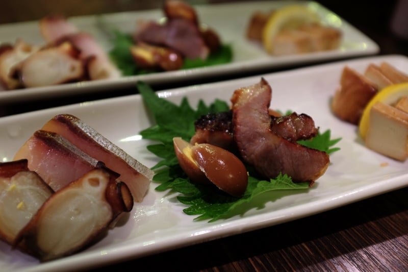 鹿児島の夜は前夜祭だけで終わるわけではありません。いつもは天文館に繰り出すのですが、今年は2012年にオープンしたという鹿児島中央駅前にある屋台村「かごっまふるさと屋台村」に行ってみました。金曜日の夜だったからか、とても賑わっていました。その中でも入ったお店では焼酎も美味しく、燻製の香りと独特の味にも担当しました。