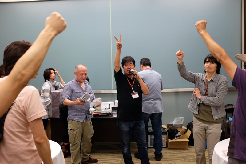 恒例のじゃんけん大会も相変わらず大盛り上がりでした。当社からは新作のTシャツを出していたのですが、どうもマズイ人たちが獲得してしまったようです…(汗)。