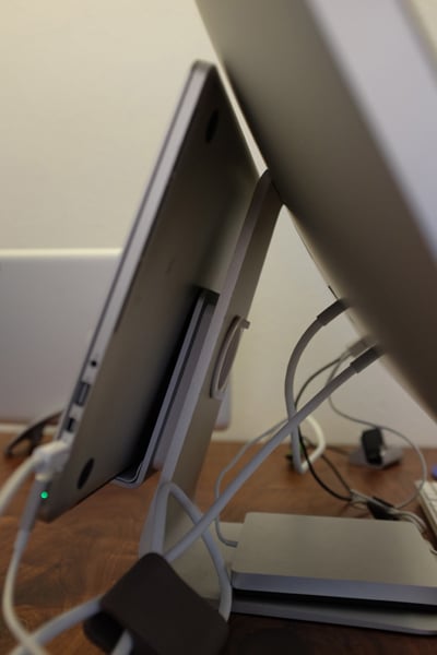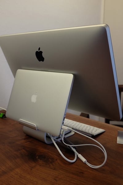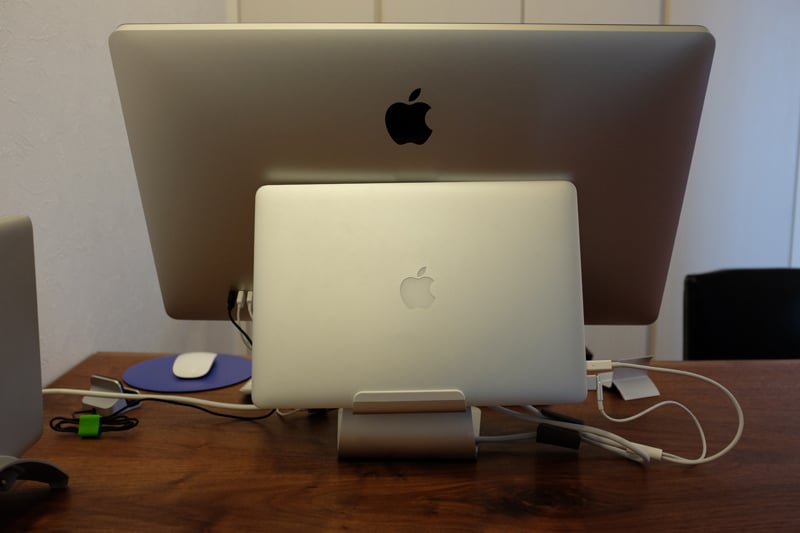 しかし、AluRackの良いところは場所をほとんど取らないということです。ディスプレイ後ろにしか場所を取らないので狭い場所でも使えますし、なんといっても前からはケーブルなどは一切見えずに、まるでiMacを使っているかのようにシンプルになるのです。