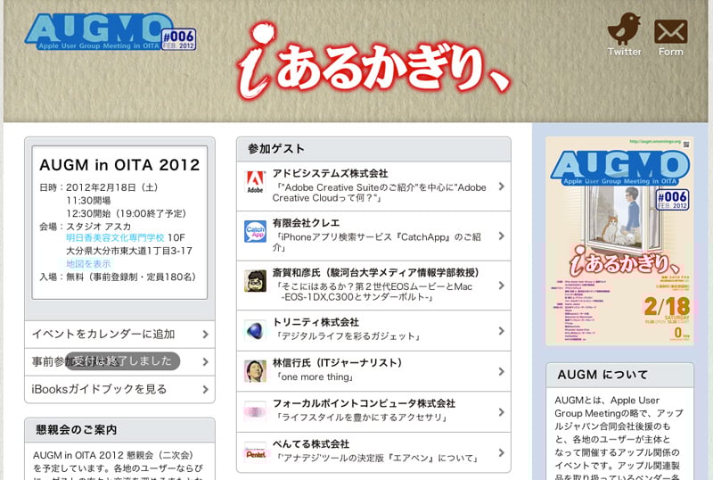 過去に何度この手のタイトルを書いたか分かりませんが、あんまり捻ることもできないのでそのまま事実ということで、今週末はApple User Group Meeting in OITA(AUGM大分)が開催されます。1年に1度の開催で、それに合わせて大分の方々に触れあい、自慢の商品を紹介し、美味しいものを食べ、名所に連れて行ってもらうというのが楽しみで仕方がありません。