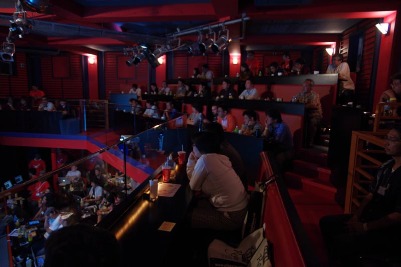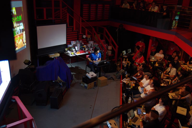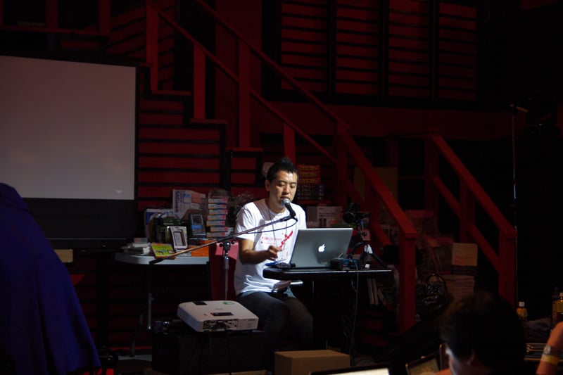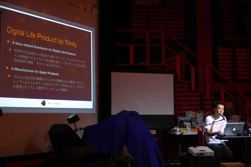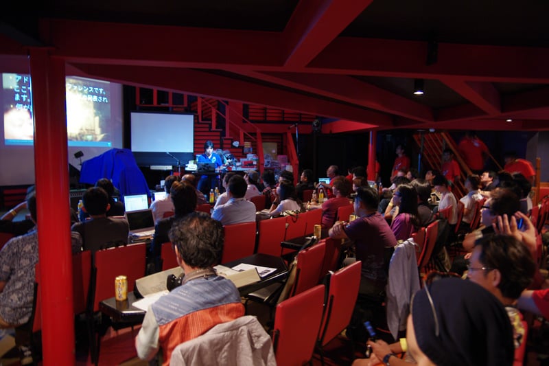 今回のAUGM沖縄では会場がライブハウスであるということもあってステージ上でのプレゼンテーションになること、2階席があるため上から見下ろす観客がいること、沖縄らしく朱色の柱や壁になっていることなどから、とても新鮮なイメージでした。