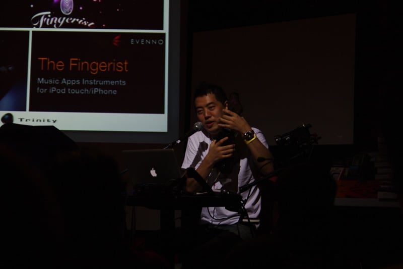 時間がなかったので、当初は予定していなかったThe Fingeristのデモンストレーションですが、前日に「期待してます」なんてお話しをいただいたりして急遽「三線」というアプリをダウンロードしてみたものの、なぜかうまく音が出せず断念しました。しかし、それでも少しだけでも何かやろうといつもの「Guitar」アプリで「島唄」を歌おうと思ったのですが、会場入りしてからしか練習する時間が取れずに前のプレゼン中に裏で練習するなどしていました。(それが漏れ聞こえていたという話もあり)