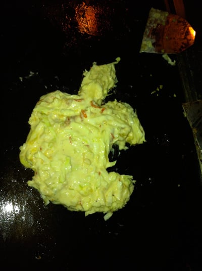 というわけで、東京湾を臨みながらながらのもんじゃ焼き、お好み焼き、焼きそばは絶品でした。お好み焼きを作ったら、こんな形にしなくては気が済まない人たちが多かったようで…。