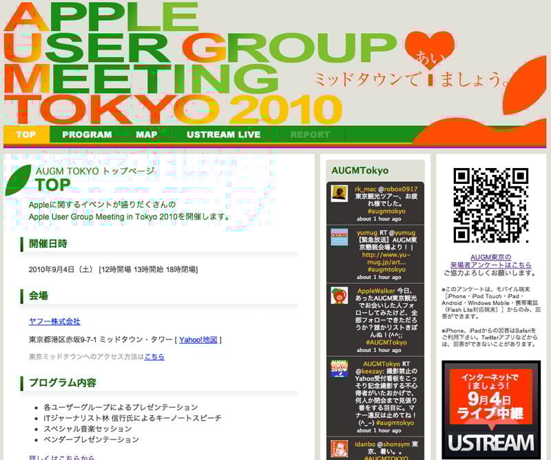 昨日、9月4日(土)に久々となるApple User Group Meeting in Tokyo 2010(AUGM東京2010)が開催されました。AUGM東京2010自体は、本当に多くの方にご支援いただき、予想を大幅に上回る大盛り上がりを見せて終了しました。いつものように事前に告知しなかったりしたのは、少し関わり方が違ったことによります。