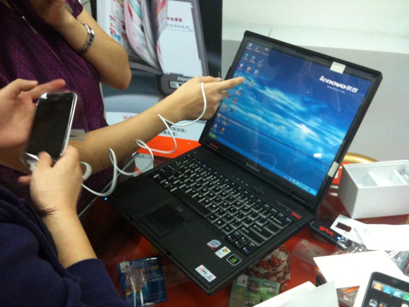私が現在所有しているiPhone 3GS 32GBが黒で、こちらでケースなどの装着チェックなども考えると白を購入した方が良いと思ったので、白購入を希望したところ売り切れているということで「近くの別の店舗にある」というので行ってみると、車で30分以上も離れた場所でした(中国の人たちの「近い」はあまり信用できません)。そこで製品を引き渡してもらうのですが、アクティベーションもWindowsノートを引っ張り出してきて、どこかに電話しながらやっていたので、実際、あまりやったこと無いのではないでしょうか。