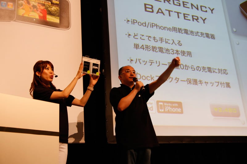 隣で高らかに商品を掲げてくれているのは、無理矢理付き合ってくれた当社スタッフです。iPhoneに対応したアクセサリーに絞って、ちょっとユニークな商品を紹介させていただきましたが、一応、みなさん欲しがってくれたので良かったです。
