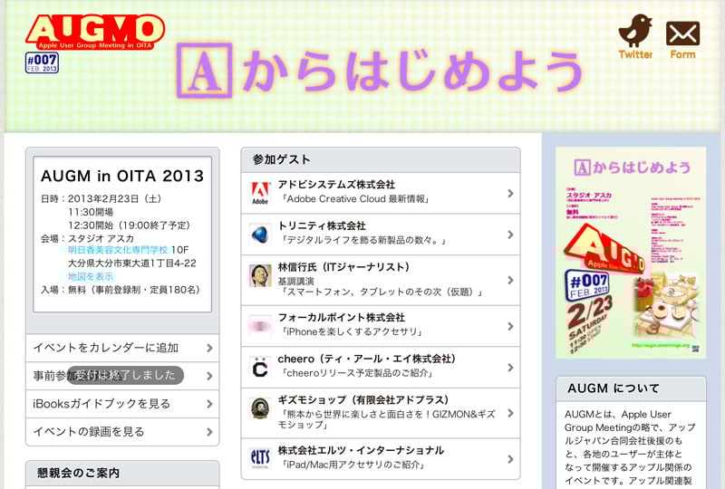 もうかれこれ7年以上通い続けているApple User Group Meeting(AUGM)ですが、これからも私のライフワークとしてお呼びがかからなくなるまで参加し続けたいイベントです。そして、2013年の始まりは第一回から参加しているAUGM大分です。