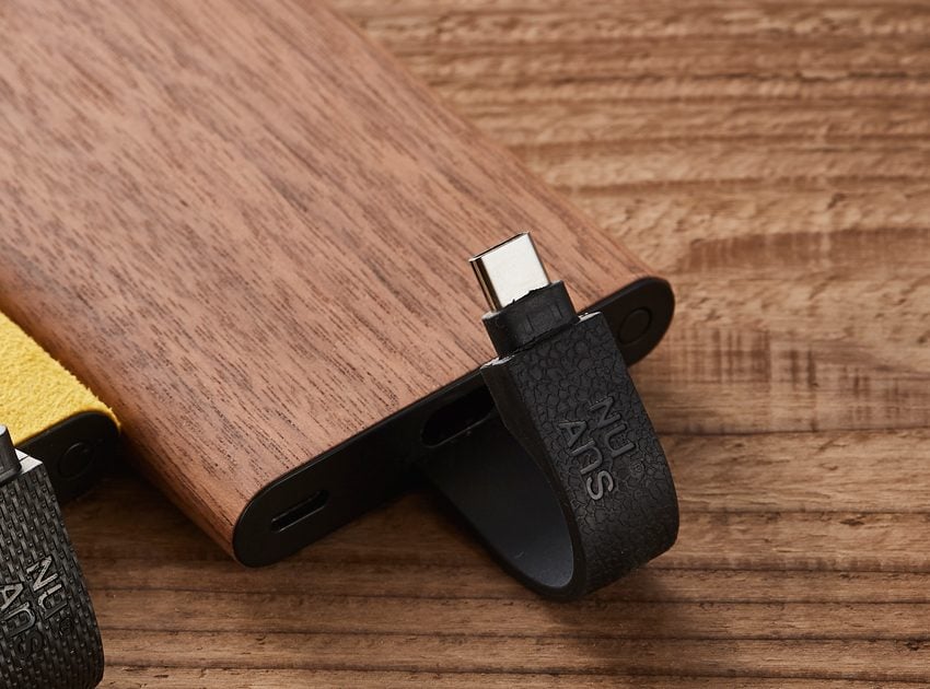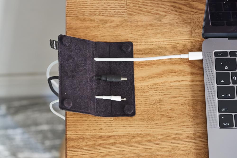 ブックカバーのような構造で、使用する時にケーブルを引っ張り出し、使用しない時は金属端子を隠して収納できるため、デスクの上の視覚的なノイズを排除できます。