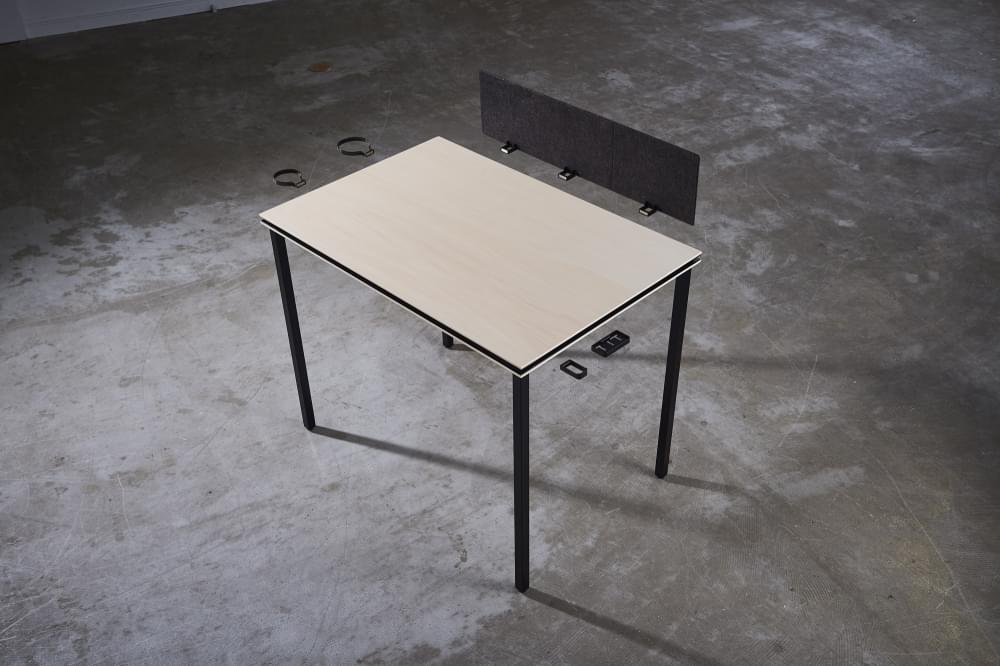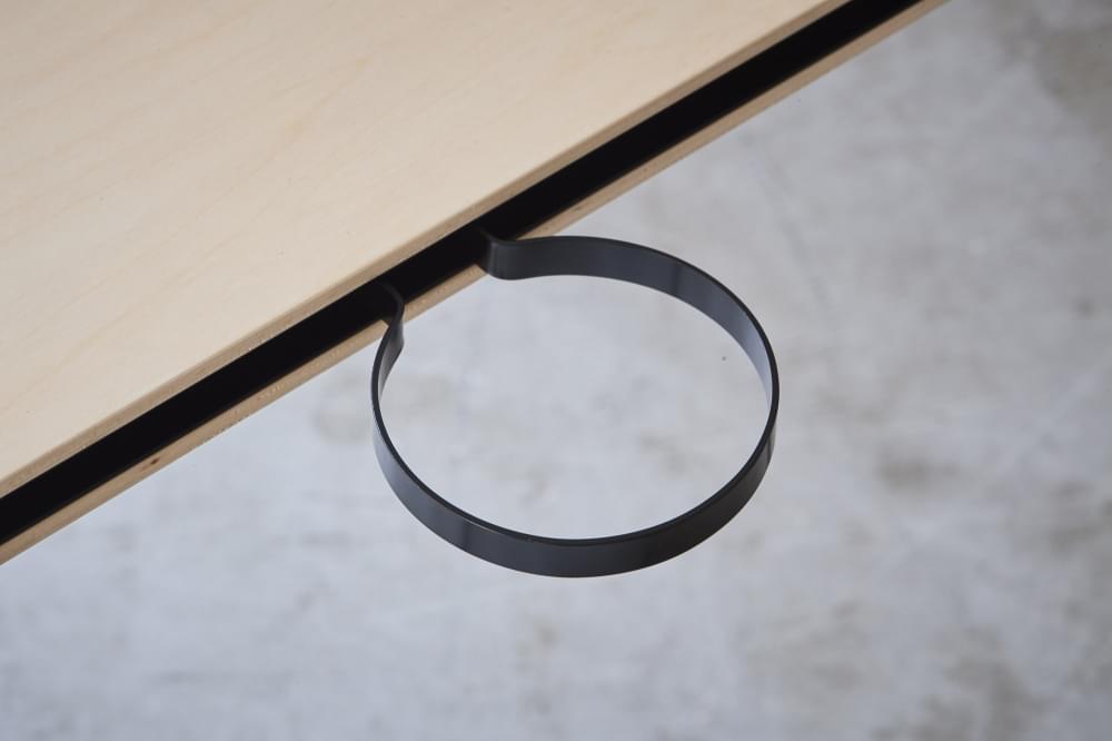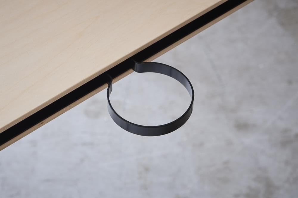 天板の全周囲にはスチール製のレールがあり、天板のたわみを防止しています。また同じくスチール製の脚を天板に直接ネジ留めすることで横揺れを防止しています。このスチール製のレールと脚により、ほかにはない細身でシンプルな構造でありながら、しっかりした剛性を持つ構造が可能になりました。