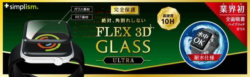 - PETフレーム+ガラスの複合素材で、ディスプレイをフルカバーする究極の立体成型最強プロテクター。AppleWatchの曲面の盤面にぴったりフィットする全面吸着式で、保護ガラス内への水の侵入も防ぎタッチ感度も抜群です。