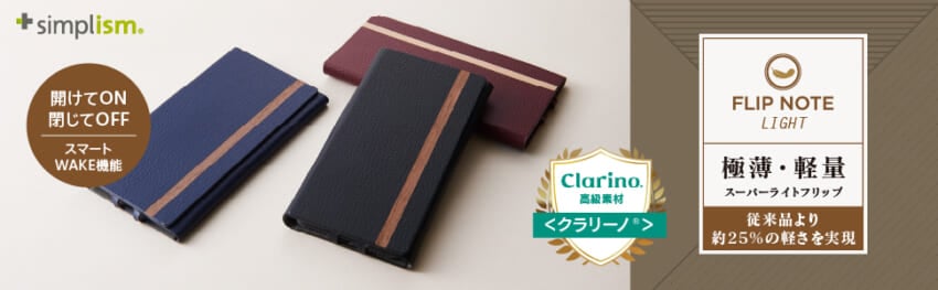 株式会社クラレの人工皮革<クラリーノ®>を採用した薄型フリップケースです。本体に樹脂を使用していないため、従来の薄形ケースよりも25%※軽く腕に負担がかかりません。