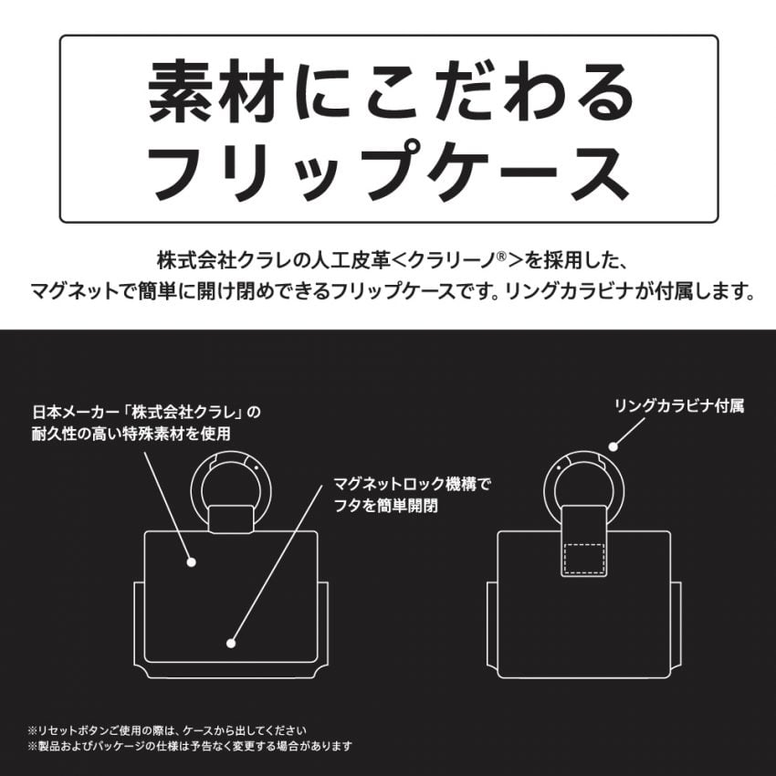 - クラレの人工皮革<クラリーノ®>を採用したフリップケースです。マグネットで簡単に開け閉めができ、ケースを装着したままでワイヤレス充電器(Qi)の使用が可能です。