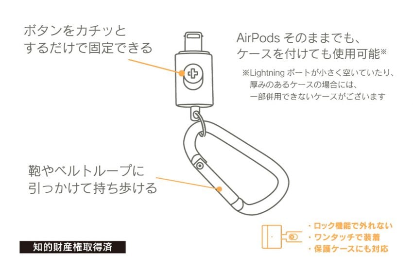 - AirPodsのLightningポートに挿して固定できる、カラビナ付きのホルダーです。装着は端末側のLightningポートに挿して、ボタンをカチッと固定するだけなので非常に簡単です。