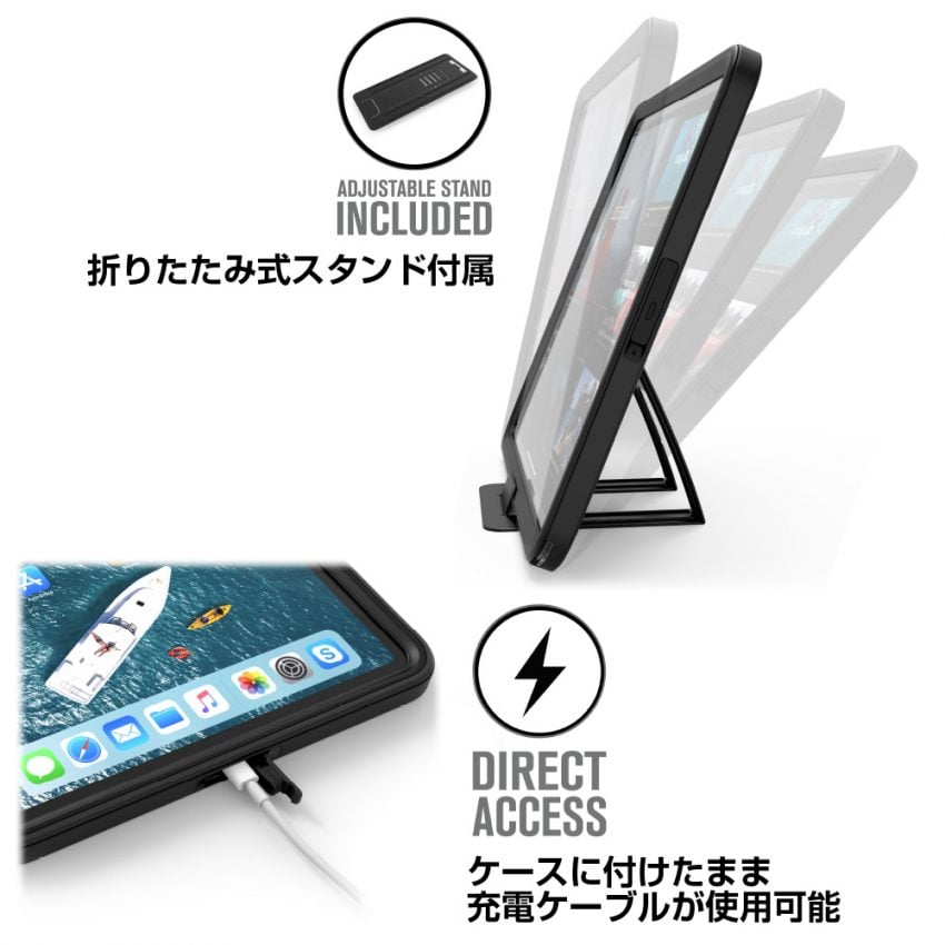 - さらに特殊な衝撃吸収機構で1.2mの高さから落下してもiPadをしっかりと守る、アメリカ国防総省の軍事規格「MIL-STD-810G」にも準拠した強靱な完全防水・防塵ケースです。