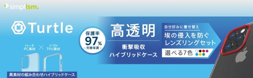 - 背面は堅い素材で傷から守り、側面はやわらか素材で衝撃から守る、ハイブリッド構造のクリアケースです。カメラ周りから埃が隙間に入るのを防ぐ、レンズリングを搭載しています。また、レンズリング を交換できる、レンズリング7色セットもラインナップ。