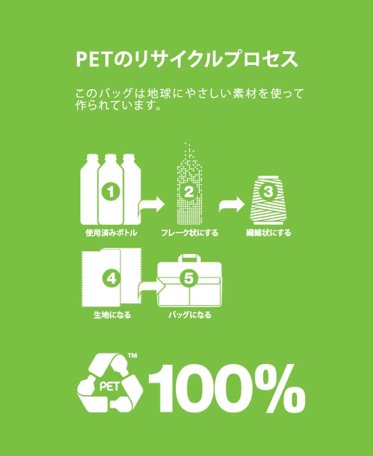 - CYCLEPETの原料は家庭から排出されたPETボトルを100%使用し、ナイロン並の軽さと強靱さに加え防水性能と通気の高さを兼ね備えたハイテク素材です。また、生地の生産、着色の方法についても環境へのダメージを極力抑えつつ、色褪せしにくくクリーンに長く使えるよう配慮されています。CYCLEPETは国際環境保護機関であるBluesign®に認定されています。