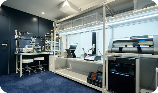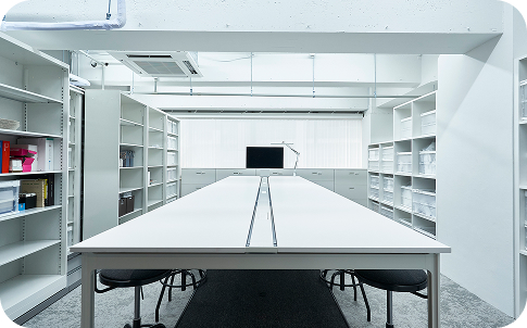新設のサンプルエリアには白色ライトを採用し、精度の高い色校正を実現。過去製品のバックアップを常時保管するストレージ機能も備えることで、確実なサポート体制を実現しました。