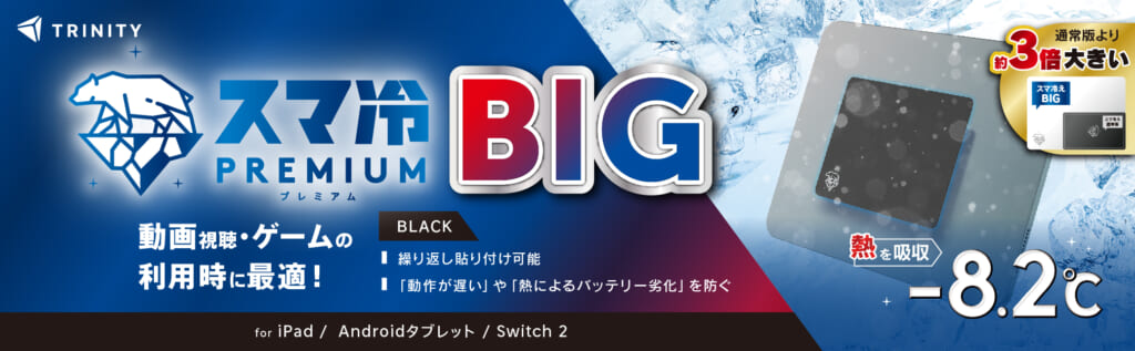 累計出荷数35万枚を突破した「スマ冷え」シリーズには、待望の新色「ネイビー」と、iPadなどのタブレットにも最適な面積を通常版の約3倍に拡大した「スマ冷えPremium BIG」が登場。動画視聴や長時間のゲームも、熱を気にせず快適に楽しめます。