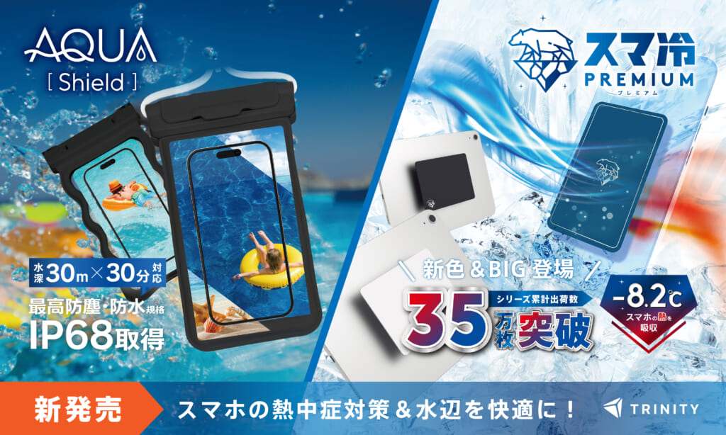 トリニティ株式会社(代表取締役:山本 洋平、本社:埼玉県新座市)は、スマートフォンの熱上昇を抑制する「スマ冷え」シリーズの新ラインナップ、およびスマートフォン用防水ケース「AQUA Shield(アクアシールド)」シリーズを発売いたします。