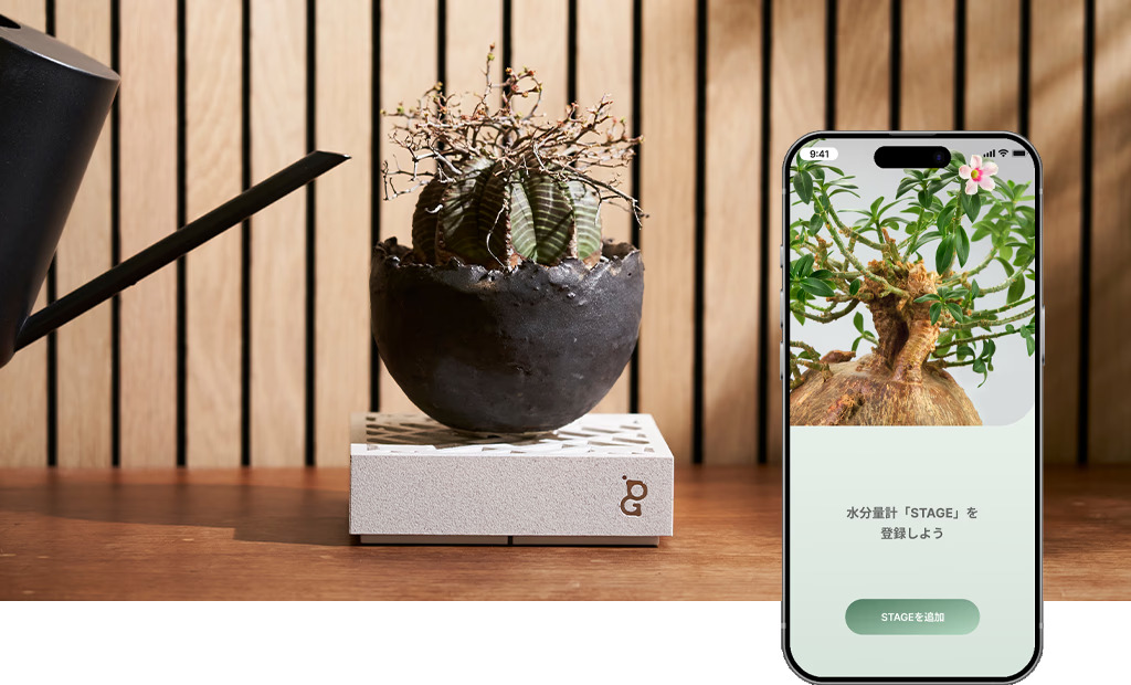 「STAGE」は、鉢を載せてアプリとつなぐだけで、インテリアになじむミニマルな佇まいで、あなたのグリーンライフを補助します。