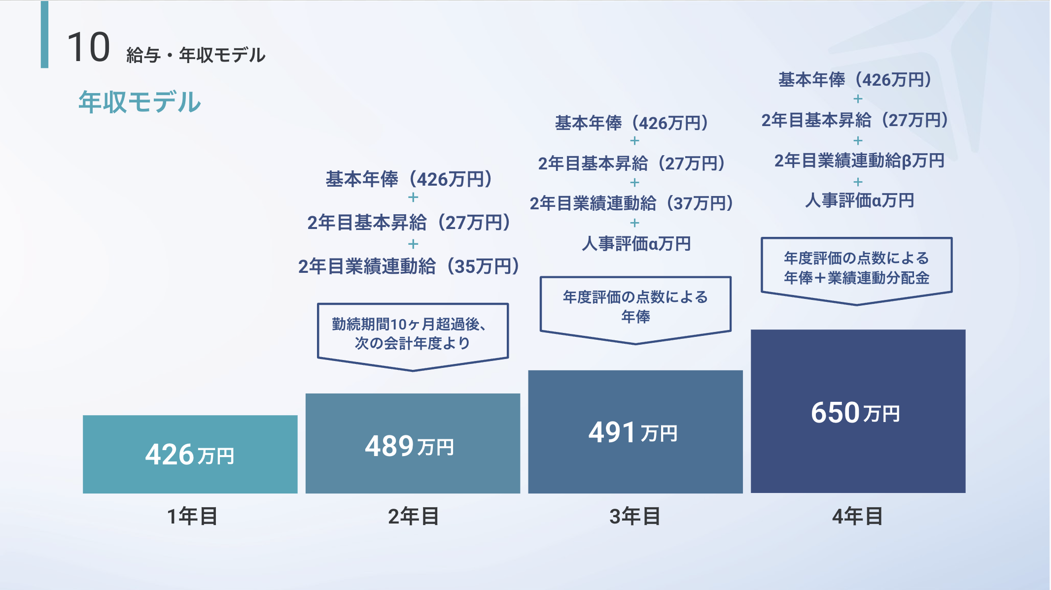 - 勤続 10 ヶ月経過後、次の会計年度より月給 1 ヶ月相当分を上限とするキャップ付き業績連動給を支給。※ただし、業績による。